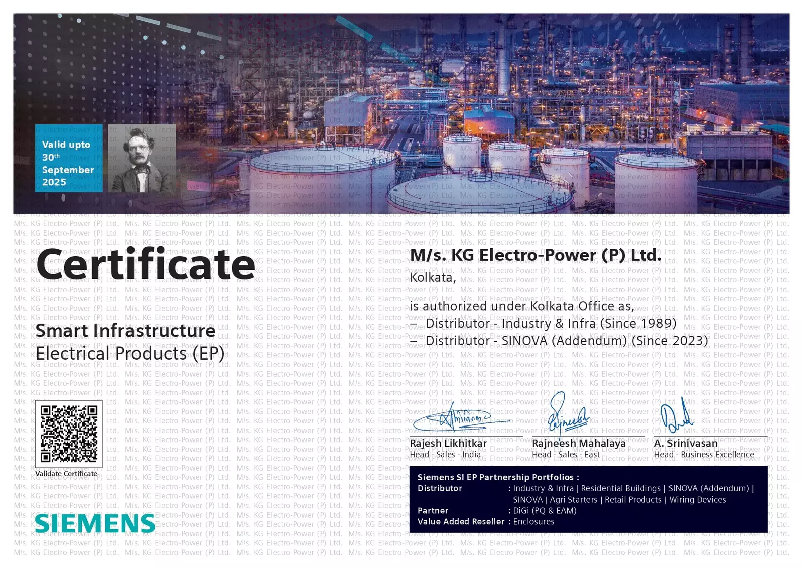Founded in 1974 as Electro-Power Enterprises, by Lt. Sri Kamal Singh Ghosal, we had humble beginnings. With hard-work and his obstinate commitment to product-knowledge based operations, we grew from strength to strength. It was in 1989, that our focus on the supply of reliable and quality products was aligned with that of the world’s leading technology manufacturer, SIEMENS. We were incorporated in 1992, and the founder’s knack for solution based interaction with customers, and ability to ensure end-to-end service of all client requirements across sectors, combined with commitment to sales excellence and innovation, KGEP became one of the leading channel partners of Siemens Ltd, a subsidiary of the Siemens AG in the eastern region, in India. We have since added other world-class brands to our portfolio, these are WEG Group (Electric Motors & Automation Solutions), SOCOMEC Group (Power Management & Monitoring Solutions) & SCHNEIDER ELECTRIC (Industrial Solutions).